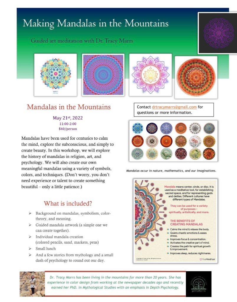Mandalas in the Mountains April 24, 2022 ~ TracyMarrs ~ Leave a comment https://www.eventbrite.com/e/326617009267